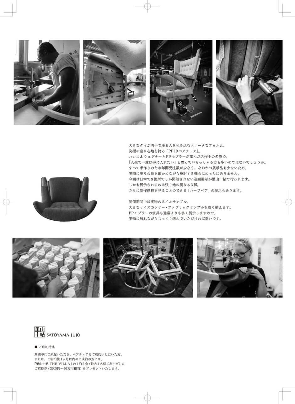次は何年後になるかわからない特別展、ハンス・ウェグナーの代表作「ベアチェア」を3台も同時に展示する「特別展」を里山十帖で開催中です! 張り地による座り心地を体感していただくための日本で初めての巡回展。ppモブラー(ハンス・ウェグナーの作品)を扱うディーラーのごく一部のみで開かれており、新潟では里山十帖だけ。関東甲信でも里山十帖だけの開催です。
